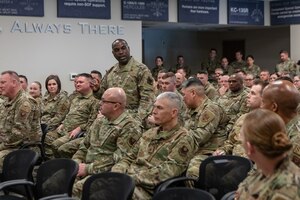 Oklahoma Air National Guard and Air National Guard Readiness Center leaders discuss shared objectives for coordination and alignment during Oklahoma’s “State of the State” visit at Joint Base Andrews, Md., July 22, 2025. Oklahoma Air National Guardsmen, representing two Air National Guard wings and